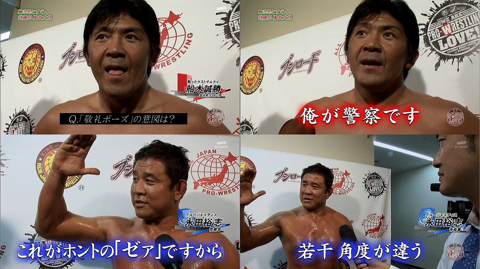 そしてバックステージでは、ハイブリッド船木とジャスティス永田による凡人には理解不能の敬礼ポーズイデオロギー論争が勃発。